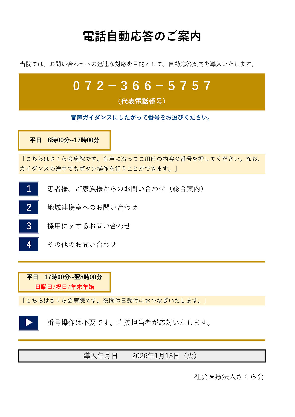 お問い合わせへの迅速な対応を目的として、2026年1月13日(火)より代表電話(072-366-5757)に自動応答案内を導入いたします。